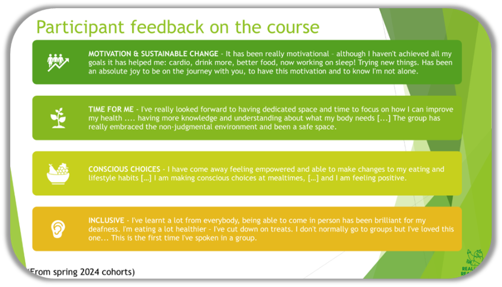 Real Food Real Health is a vibrant and local community-based NHS programme that empowers people to improve their health, manage their weight, and (where relevant) support type 2 diabetes management in a way that works for you and is sustainable in the long-term.